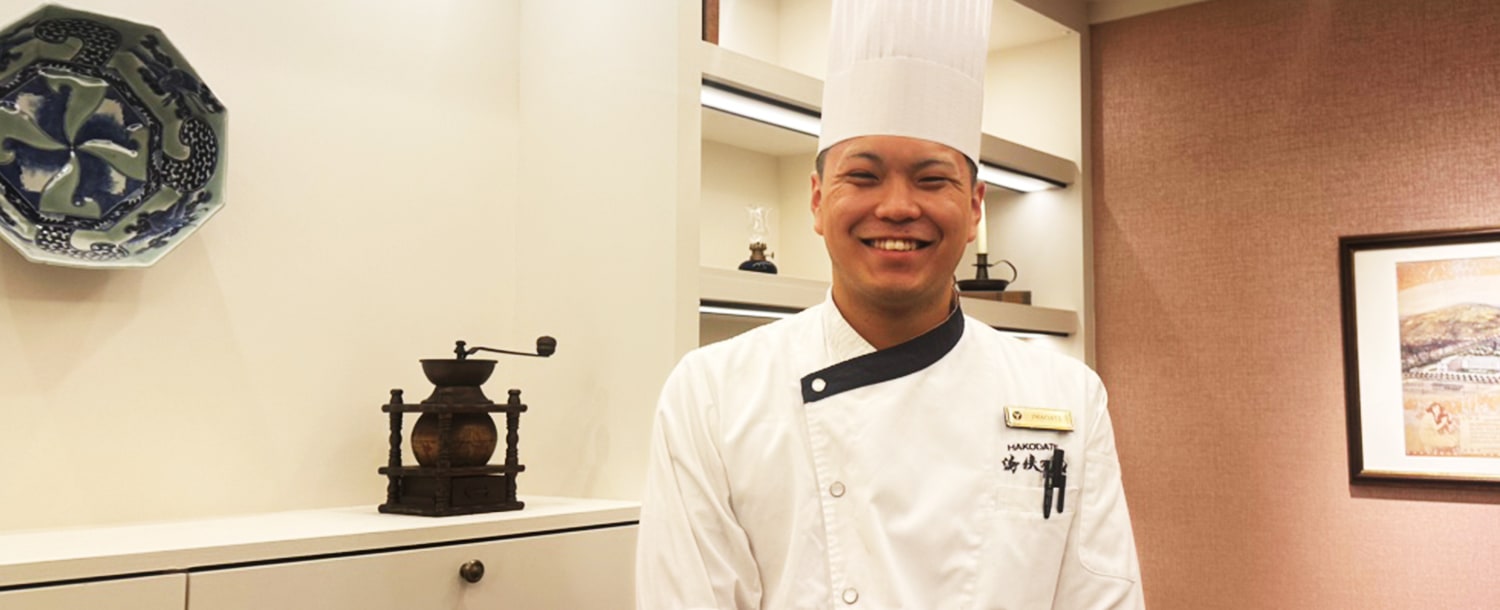 HAKODATE海峡の風のお食事処「函館銀座軒」という洋食フルコースの会場調理部門で、主に朝食と夕食の営業対応と仕込みを担当しています。調理には裏方的なイメージがあるかもしれませんが、自ら料理をサーブすることもあり、意外にお客様と触れ合う機会の多い仕事です。