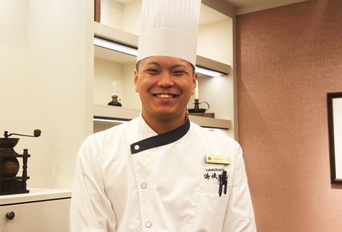 HAKODATE海峡の風のお食事処「函館銀座軒」という洋食フルコースの会場調理部門で、主に朝食と夕食の営業対応と仕込みを担当しています。調理には裏方的なイメージがあるかもしれませんが、自ら料理をサーブすることもあり、意外にお客様と触れ合う機会の多い仕事です。